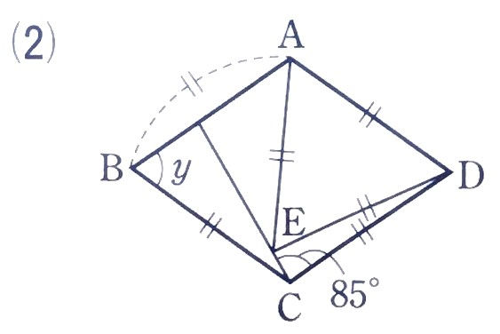 次の図で、同じ印をつけた辺が等しいとき、∠x、∠yの大きさを求めなさい。