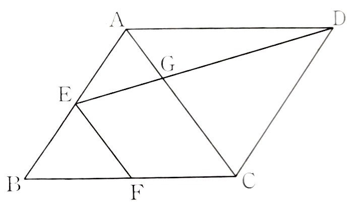 下の図の四角形ABCDは、平行四辺形である。辺AB、BCの中点をそれぞれE、Fとし、点Eと点Fを結び、線分DEと対角線ACとの交点をGとする。このとき、あとの問いに答えなさい。