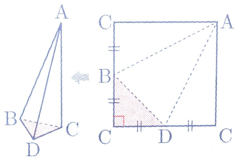 1辺が12cmの正方形の紙を折って、下の図のような三角錐をつくる。この三角錐の体積を求めなさい。